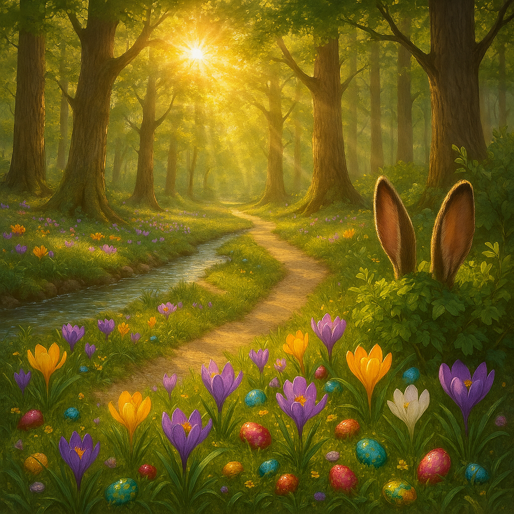 Im Drehen erspäht sein Auge wieder etwas, was nicht in den Wald gehört. Schnell läuft er an den Sträuchern und Büschen vorbei zu einem kleinen hellblauen Plüschosterhasen.  Hellblau, freut Murgel sich, seine Lieblingsfarbe, er drückt den kuscheligen Hasen liebevoll an sich. Etwas entfernt knackt es, als würde jemand auf einen Stock treten. Murgel folgt dem Geräusch. Noch mehr glitzernde Schokoeier. Auch diesen Schatz sammelt er ein und trägt ihn behutsam vor sich her.